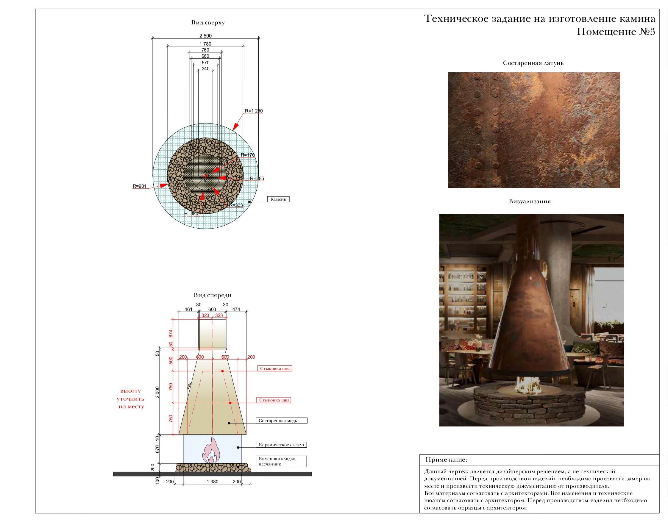 Реализован проект огромного островного камина из меди, с эффектом ржавчины и состаренности, диаметром 1600мм, и дровником диаметром 1800мм.