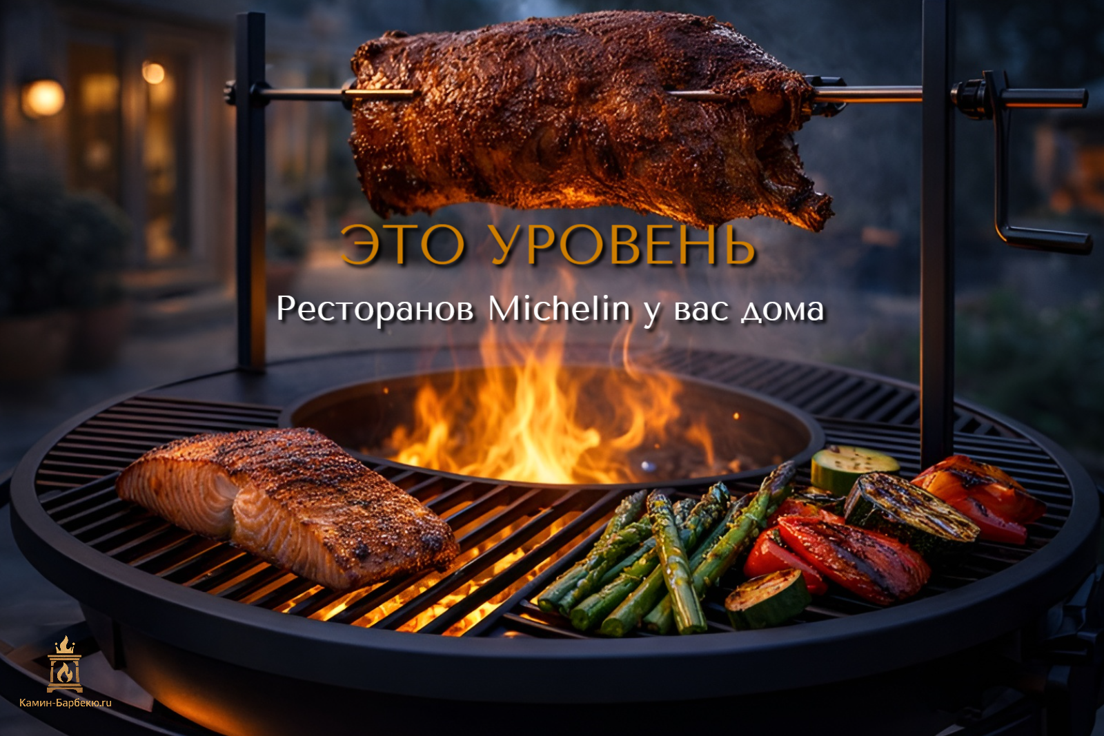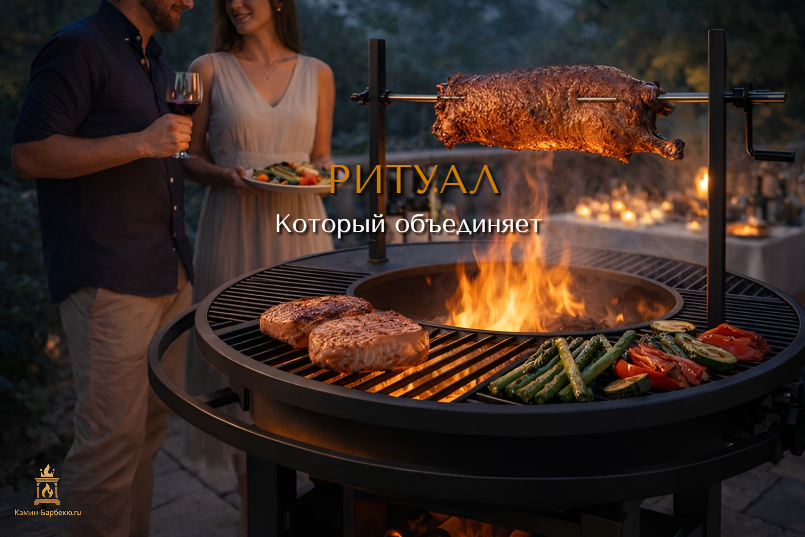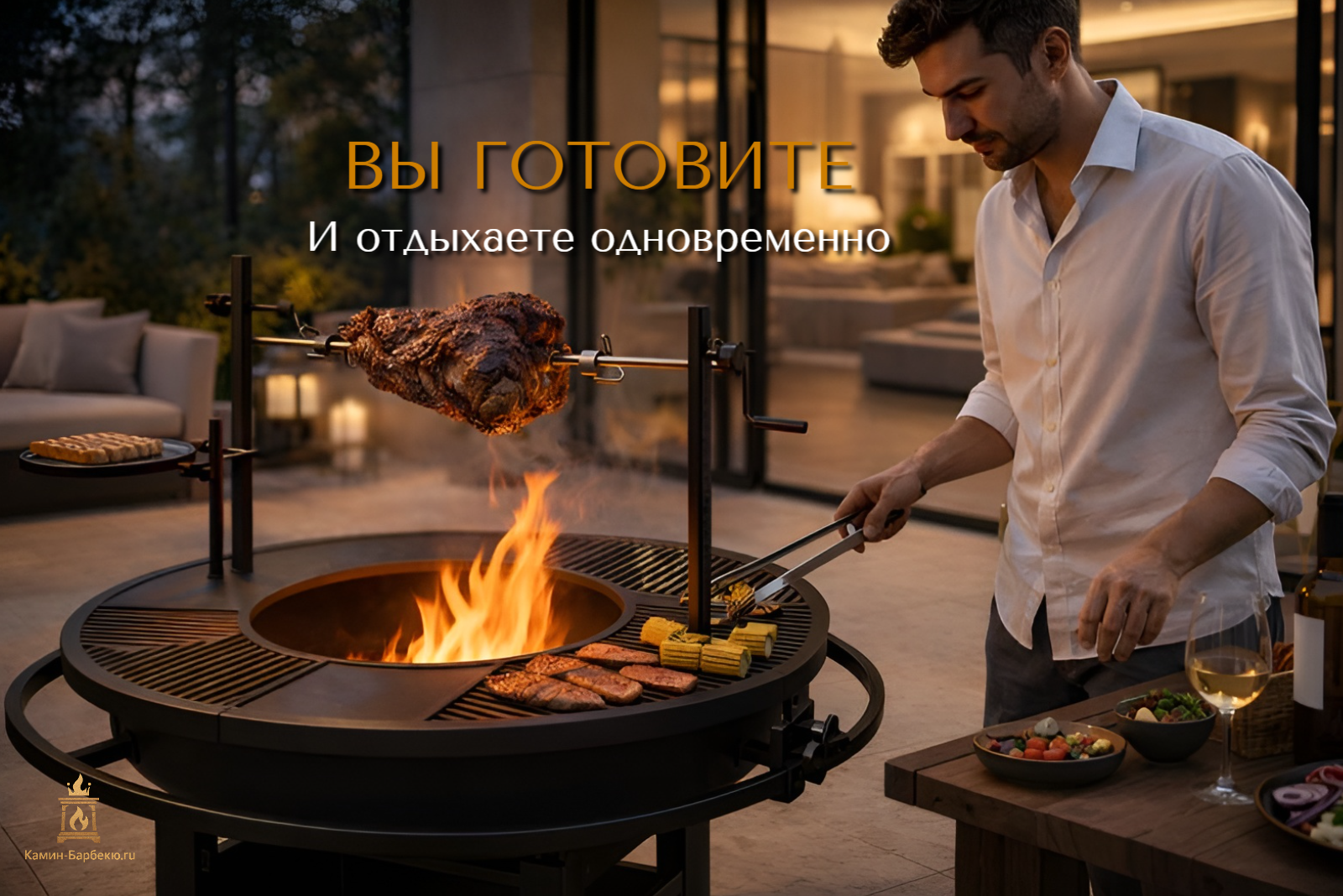 Это не просто очаг для дачи. Это полноценная уличная кухня с эффектом шоу-подачи. Вертел обеспечивает равномерную прожарку мяса, птицы и крупных кусков, а круговая гриль-зона позволяет готовить овощи, стейки и рыбу одновременно. Именно поэтому запросы вроде гриль-очаг на дровах с вертелом, очаг гриль с шампурами или уличный очаг с вертелом для террасы всё чаще приводят к выбору ROTARE.